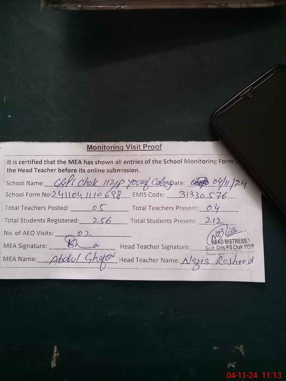 | EMIS Code: 31330576 | Name of School: GGPS CHAK 112/P YOUSAF COLONY | |||