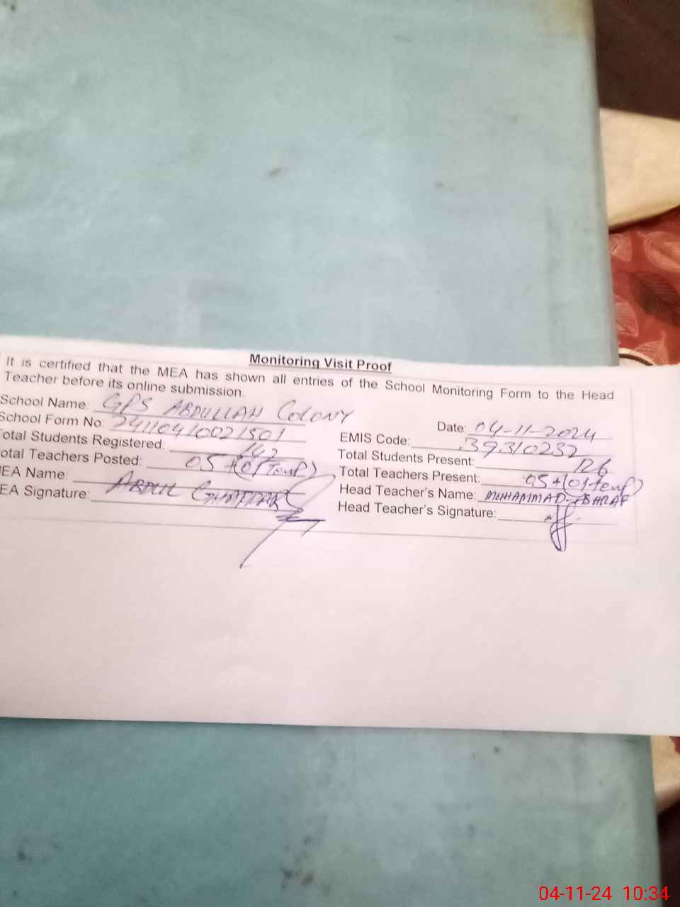 | Attendance Register | Head Teacher | MEA with School | Visit Proof |