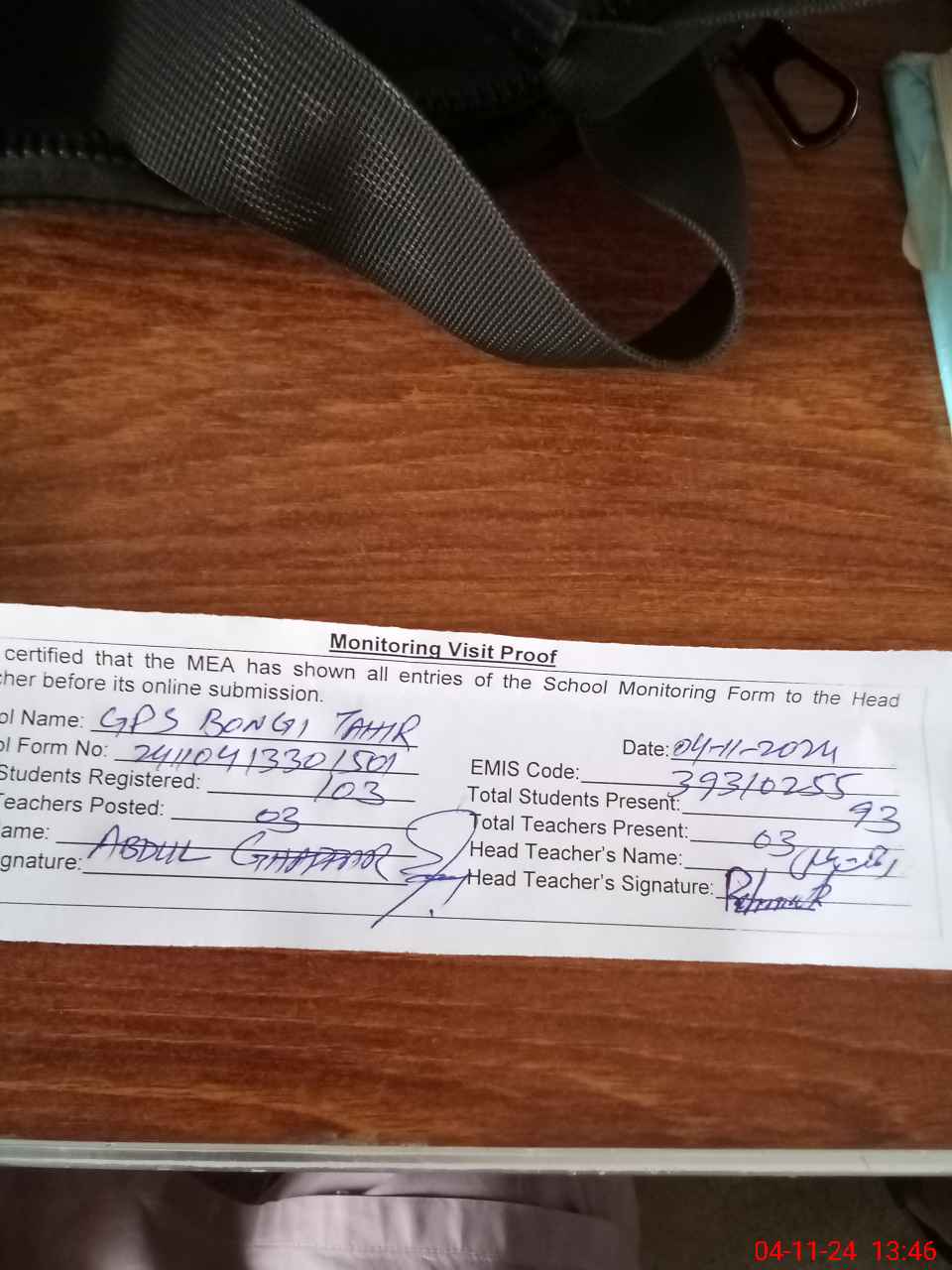 | Attendance Register | Head Teacher | MEA with School | Visit Proof |