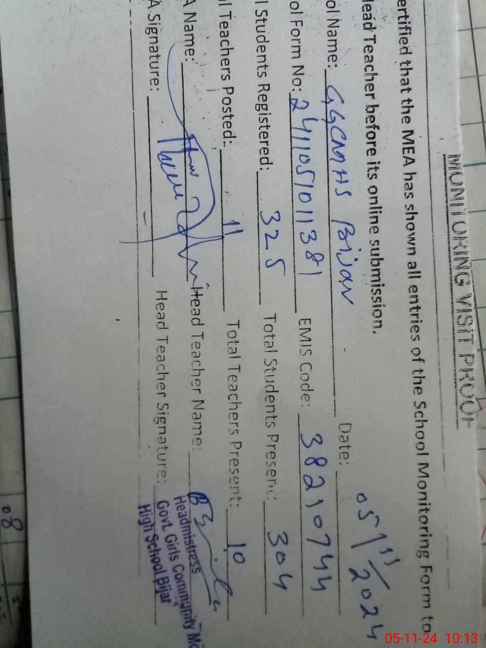 | EMIS Code: 38210744 | Name of School: GGCMHS BIJAR | |||