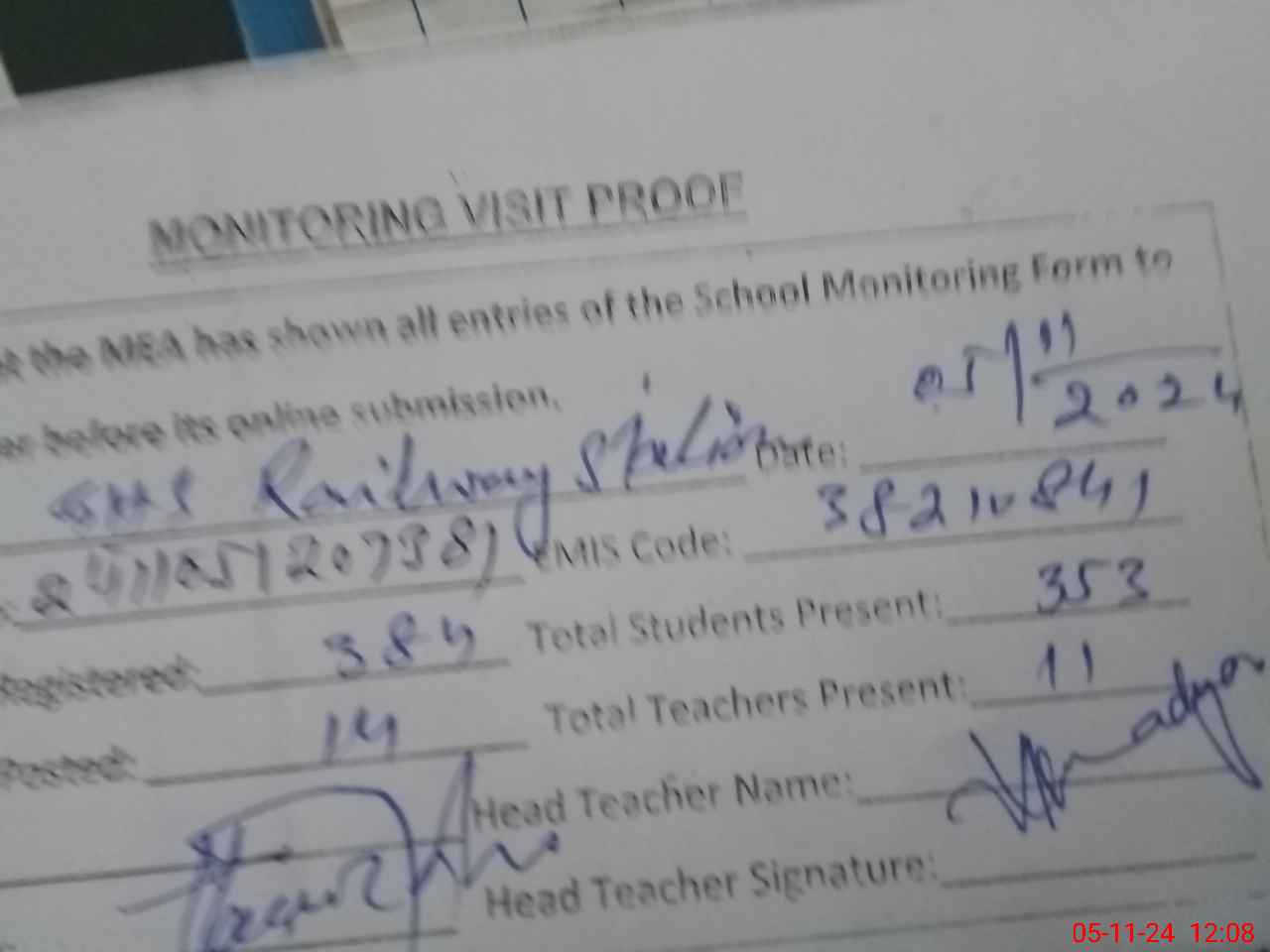| Attendance Register | Head Teacher | MEA with School | Visit Proof |
