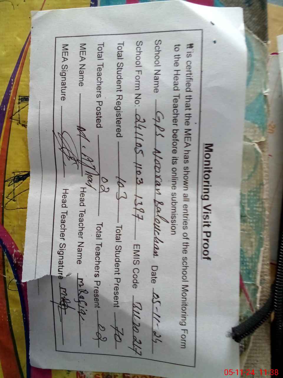 | Attendance Register | Head Teacher | MEA with School | Visit Proof |
