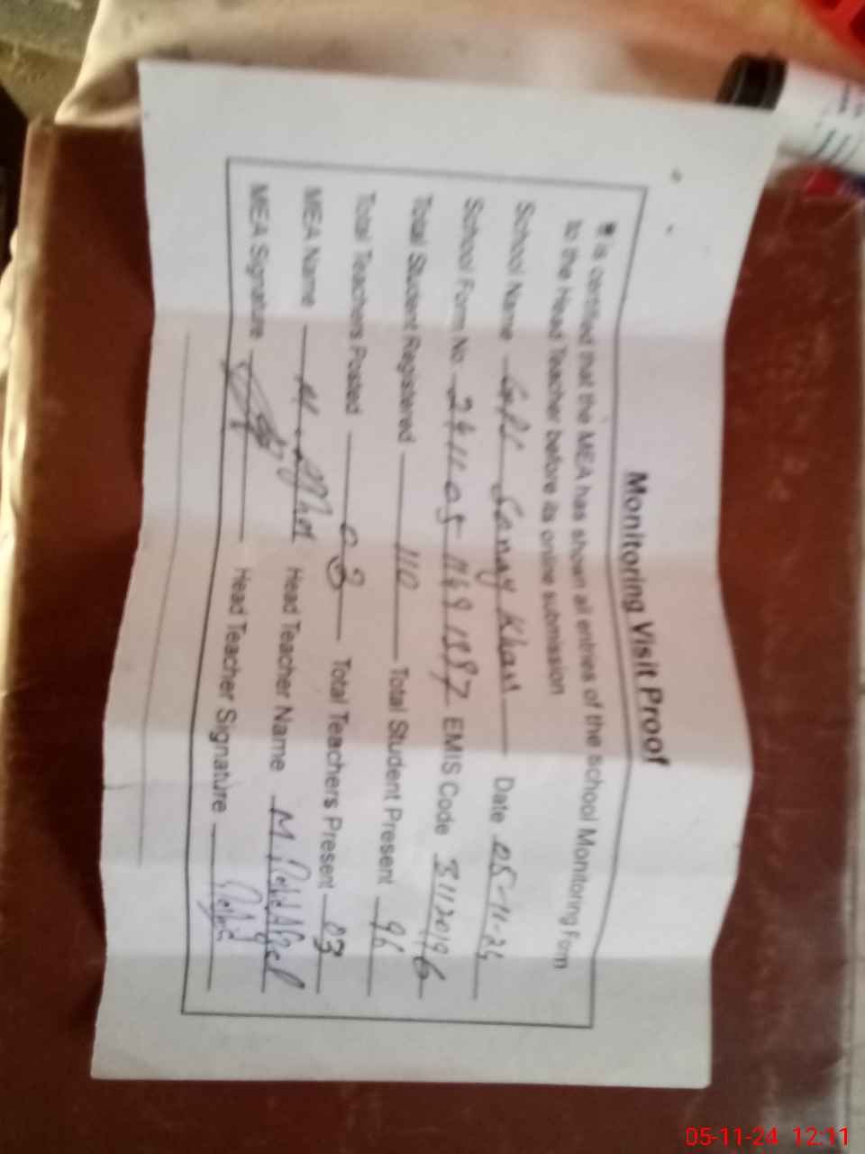 | Attendance Register | Head Teacher | MEA with School | Visit Proof |