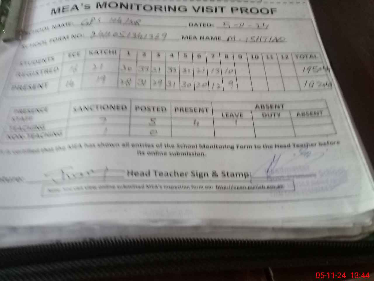 | Attendance Register | Head Teacher | MEA with School | Visit Proof |