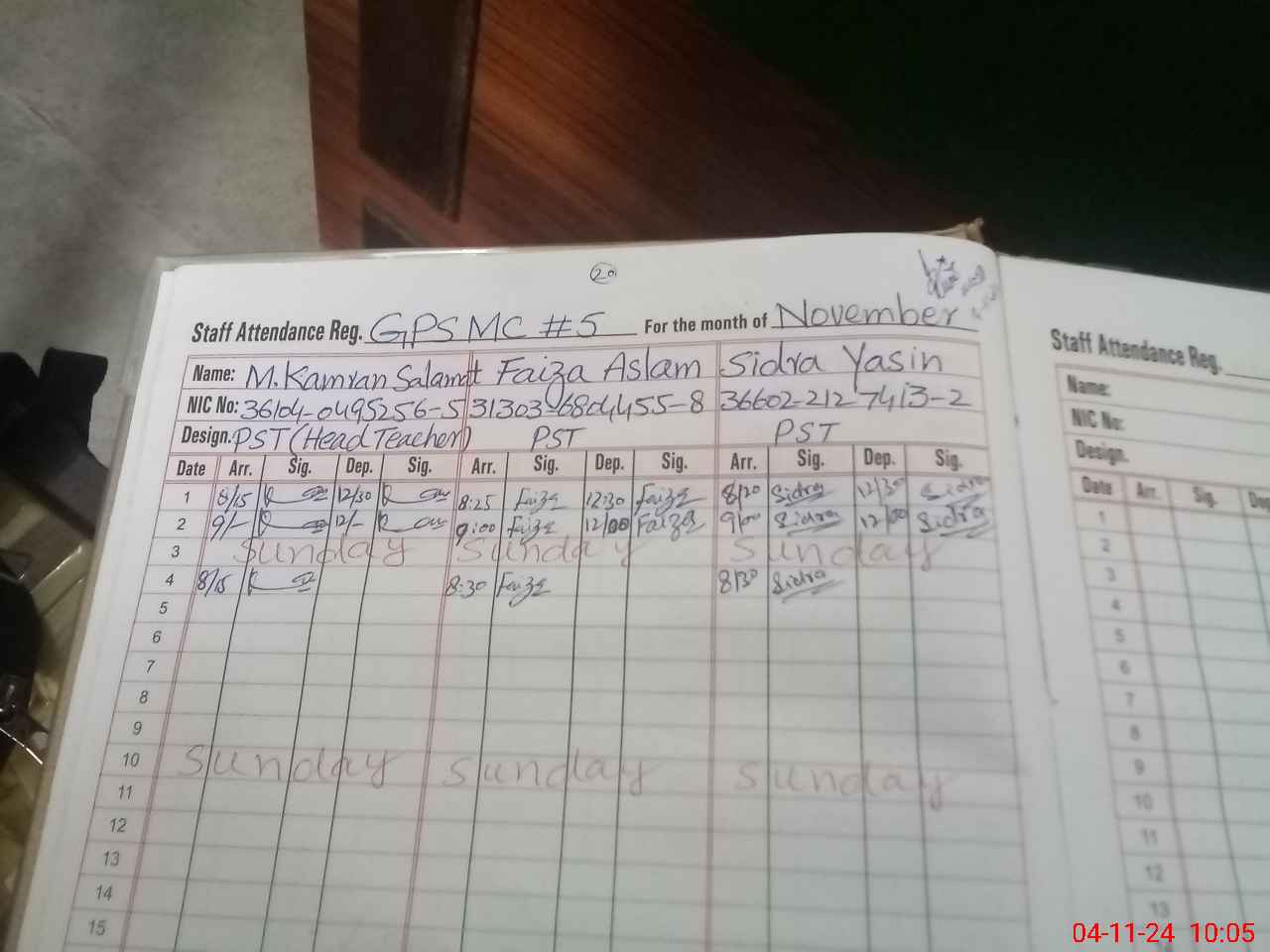 | CNIC | Full Name | Designation | R/C | Absence During Last Calender Month |