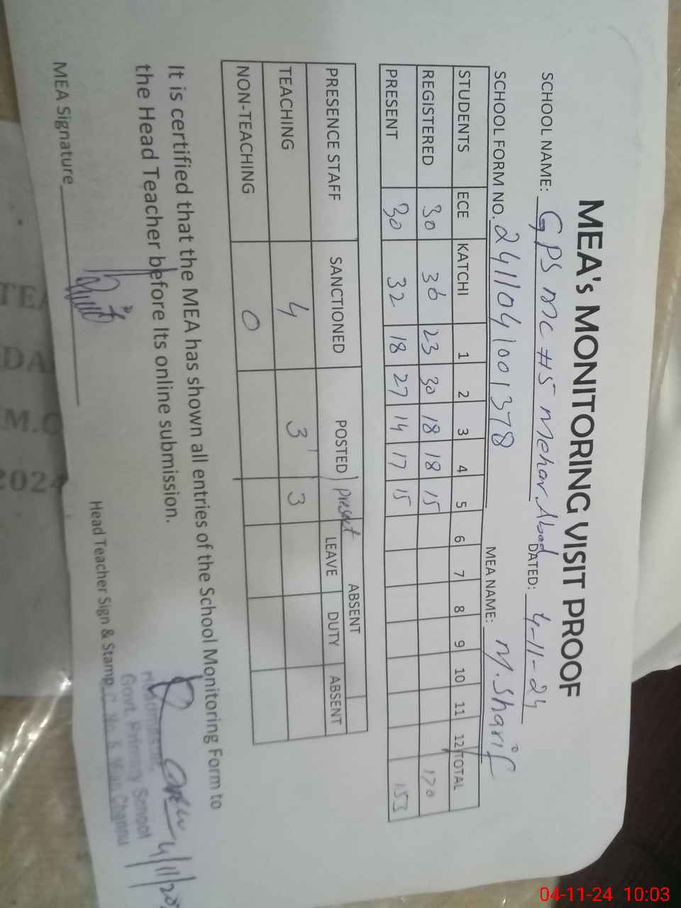 | Attendance Register | Head Teacher | MEA with School | Visit Proof |
