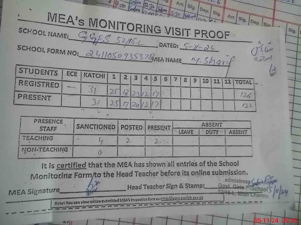 | Attendance Register | Head Teacher | MEA with School | Visit Proof |