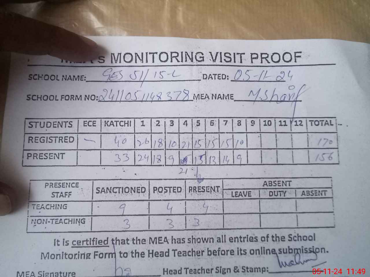 | Attendance Register | Head Teacher | MEA with School | Visit Proof |