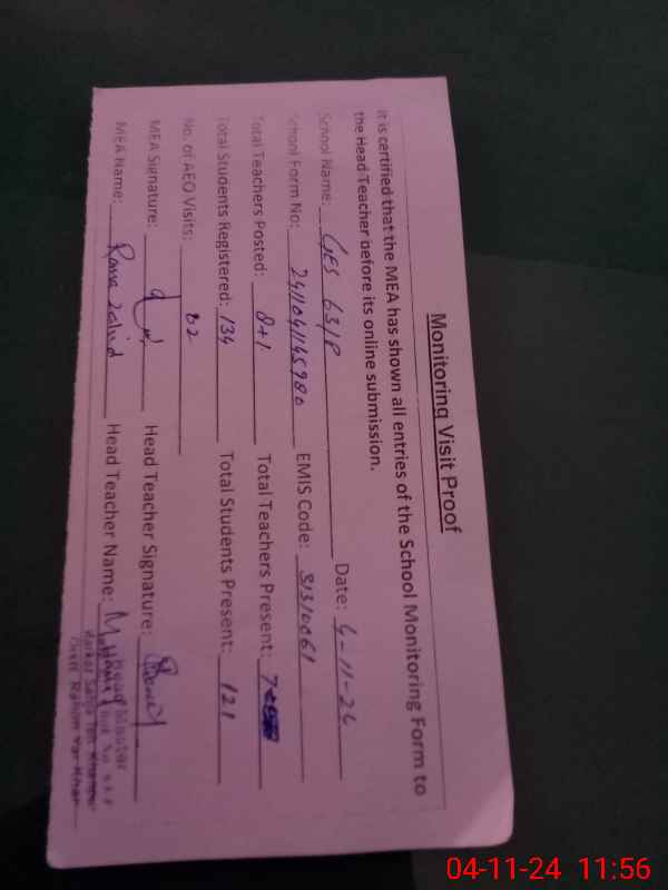 | Attendance Register | Head Teacher | MEA with School | Visit Proof |