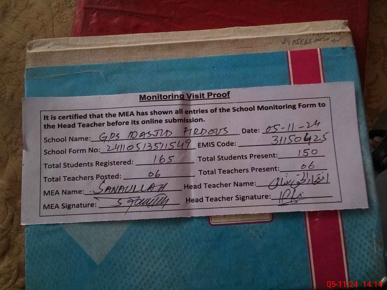 | Attendance Register | Head Teacher | MEA with School | Visit Proof |
