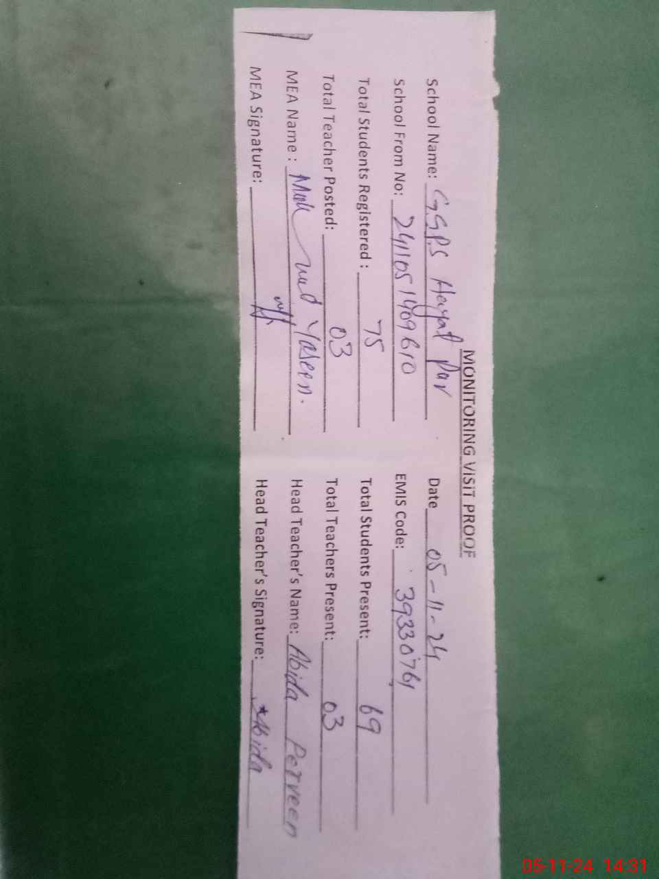 | Attendance Register | Head Teacher | MEA with School | Visit Proof |