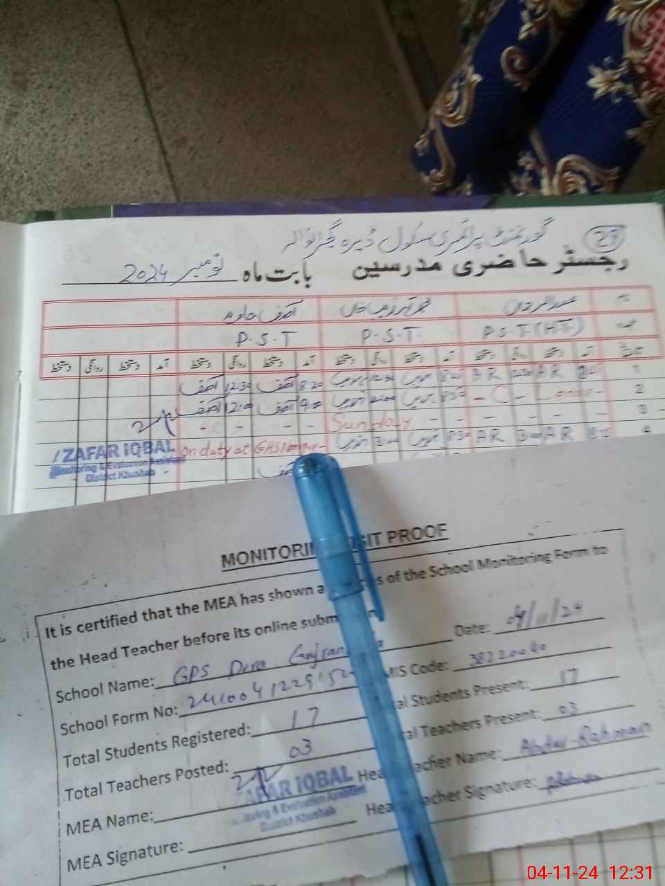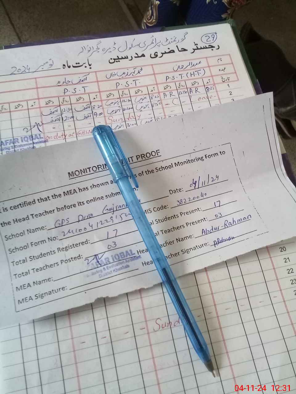 | Attendance Register | Head Teacher | MEA with School | Visit Proof |