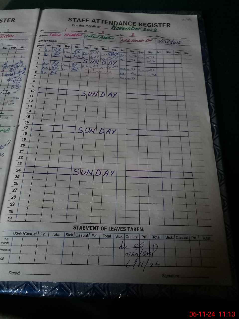 | CNIC | Full Name | Designation | R/C | Absence During Last Calender Month |