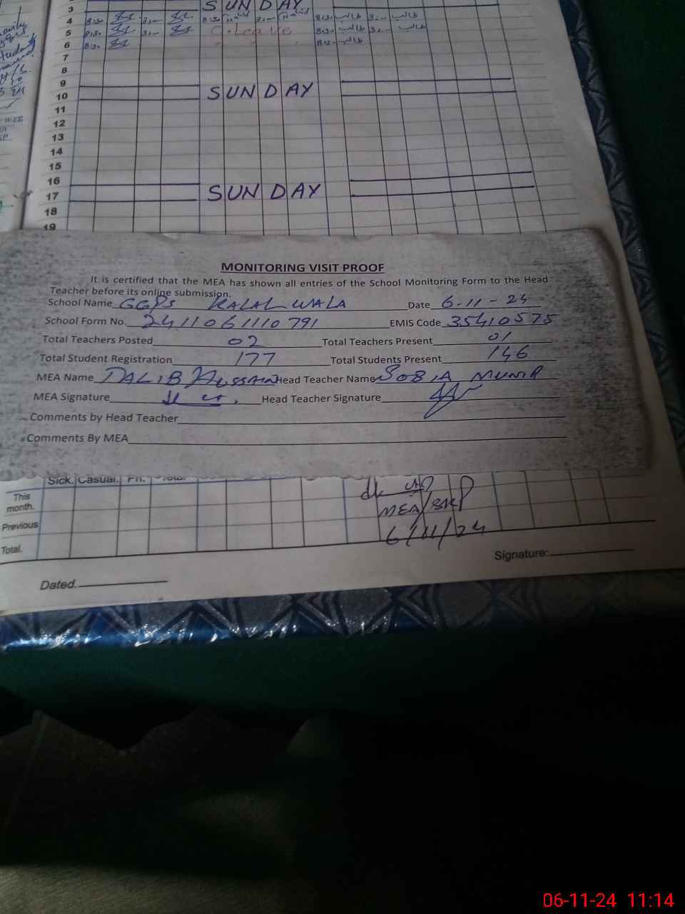 | Attendance Register | Head Teacher | MEA with School | Visit Proof |