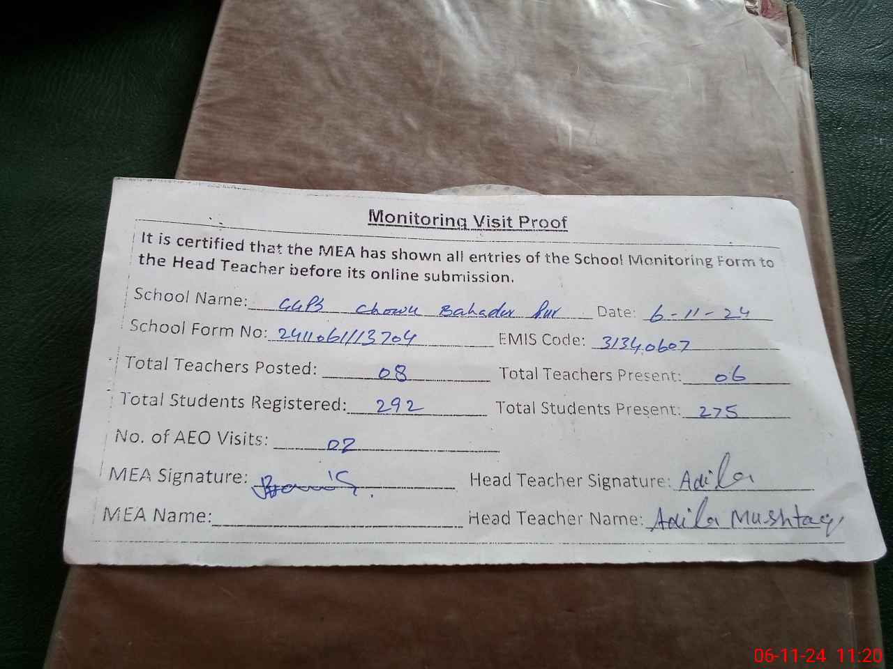 | Attendance Register | Head Teacher | MEA with School | Visit Proof |