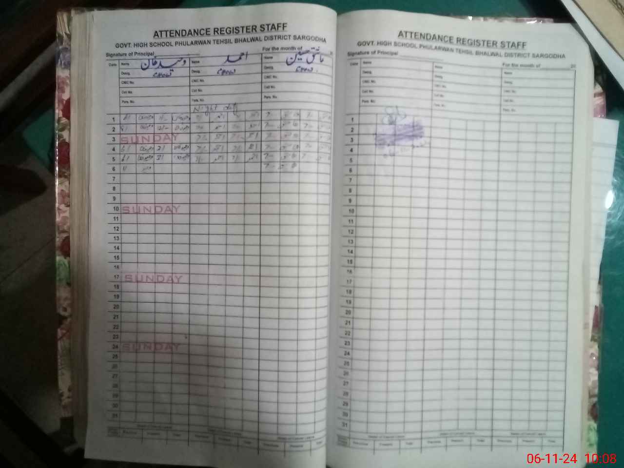 | CNIC | Full Name | Designation | R/C | Absence During Last Calender Month |