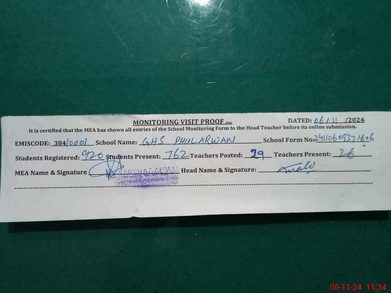 | Attendance Register | Head Teacher | MEA with School | Visit Proof |