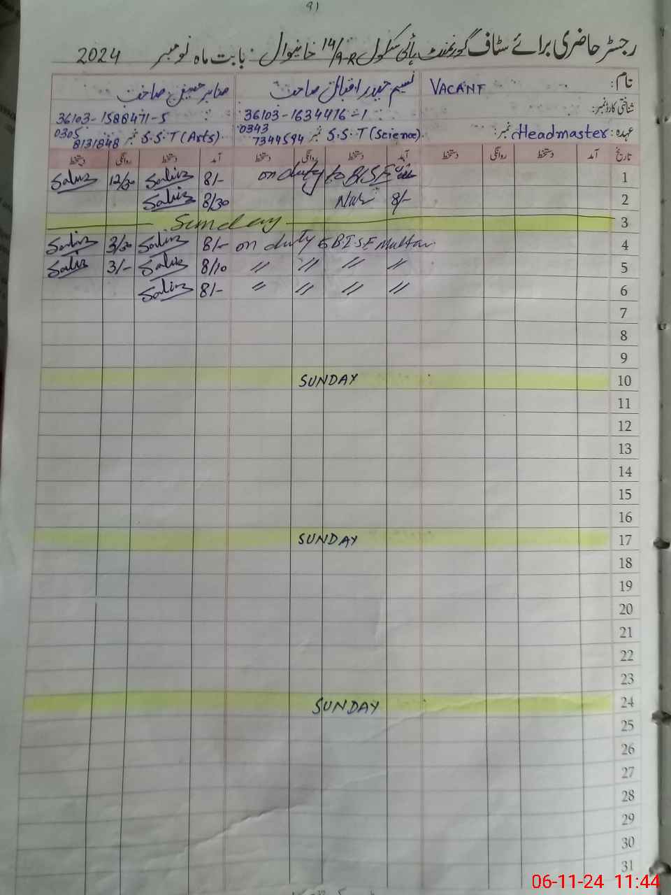 | 36**** | Na**** Ha**** Iq**** | SST | Regular | 0 | 0 | 0 | 0 | 0 | 0 | 0 | 0 | 0 | Exam Duty |