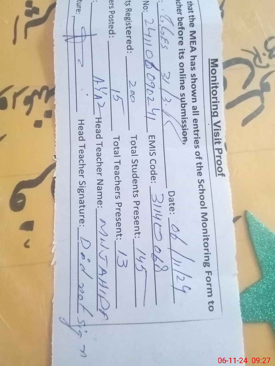 | Attendance Register | Head Teacher | MEA with School | Visit Proof |