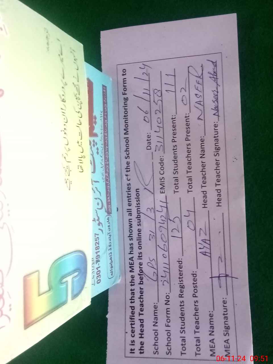 | Name: SH**** Me**** Designation: (School Headmaster's/Headmistress's) PTC/JV Phone/Cell Number: 03**** |