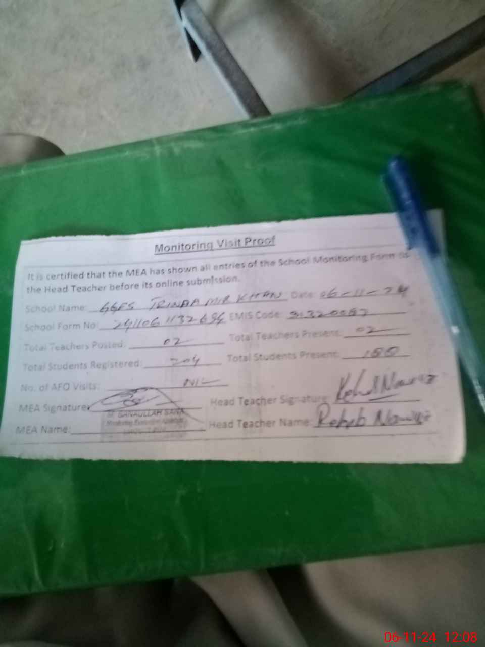 | Attendance Register | Head Teacher | MEA with School | Visit Proof |