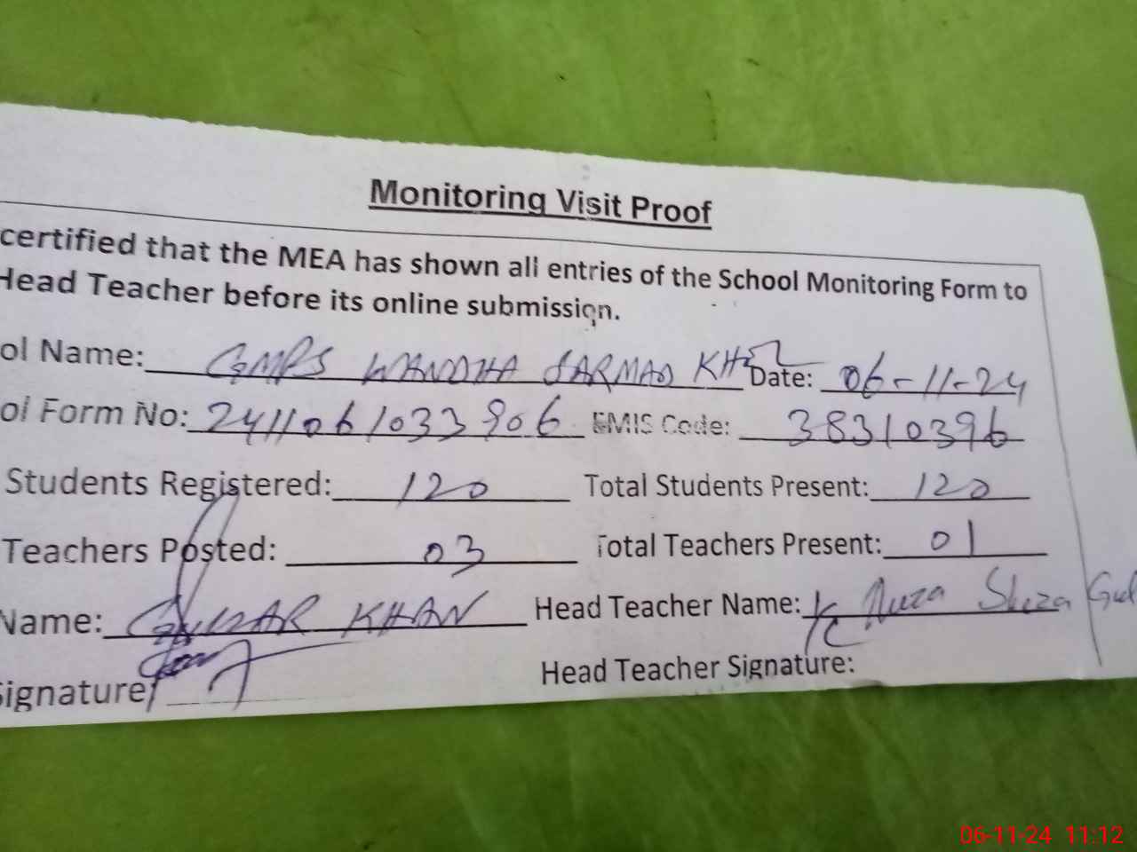 | Attendance Register | Head Teacher | MEA with School | Visit Proof |