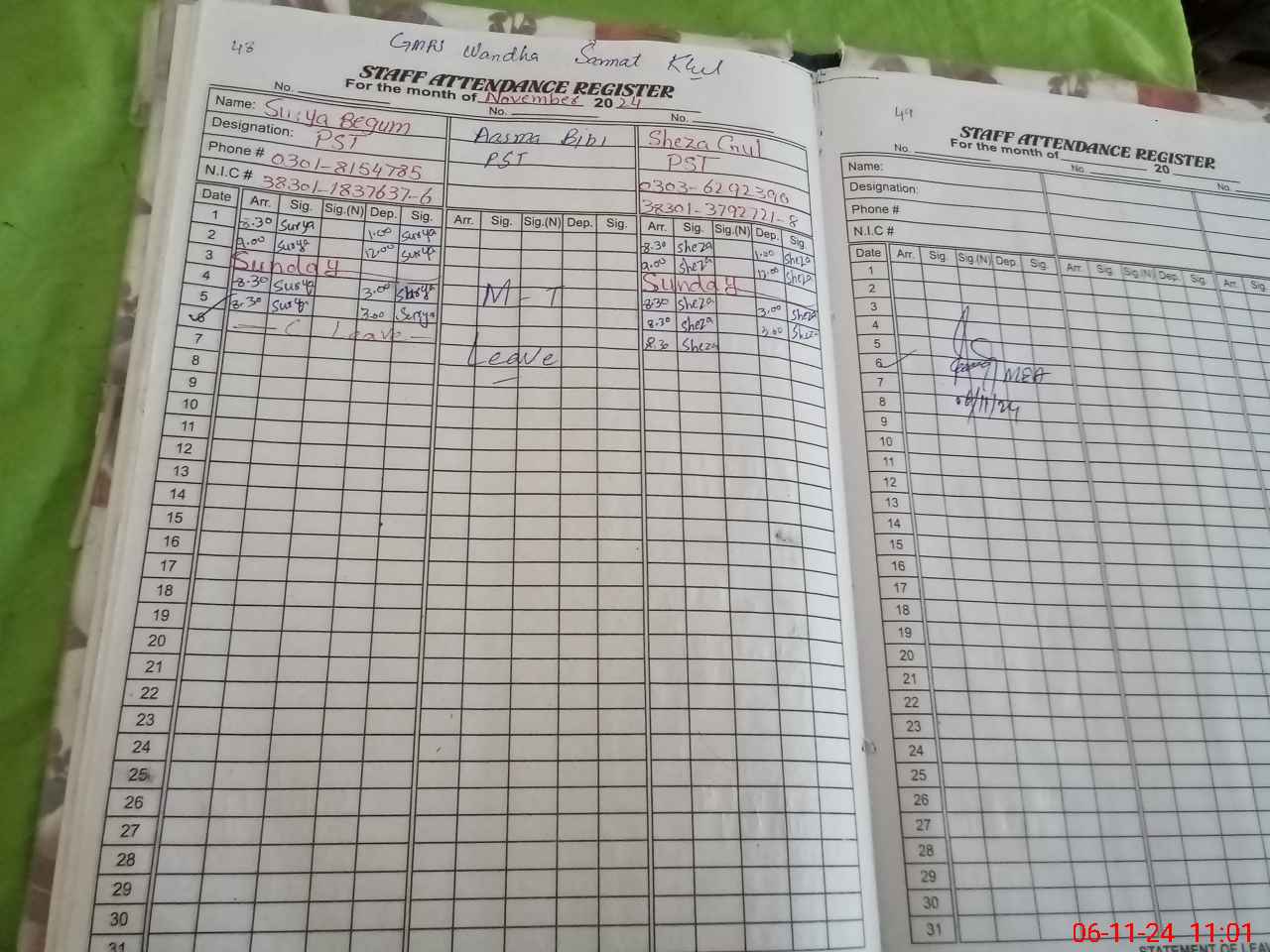 | CNIC | Full Name | Designation | R/C | Absence During Last Calender Month |