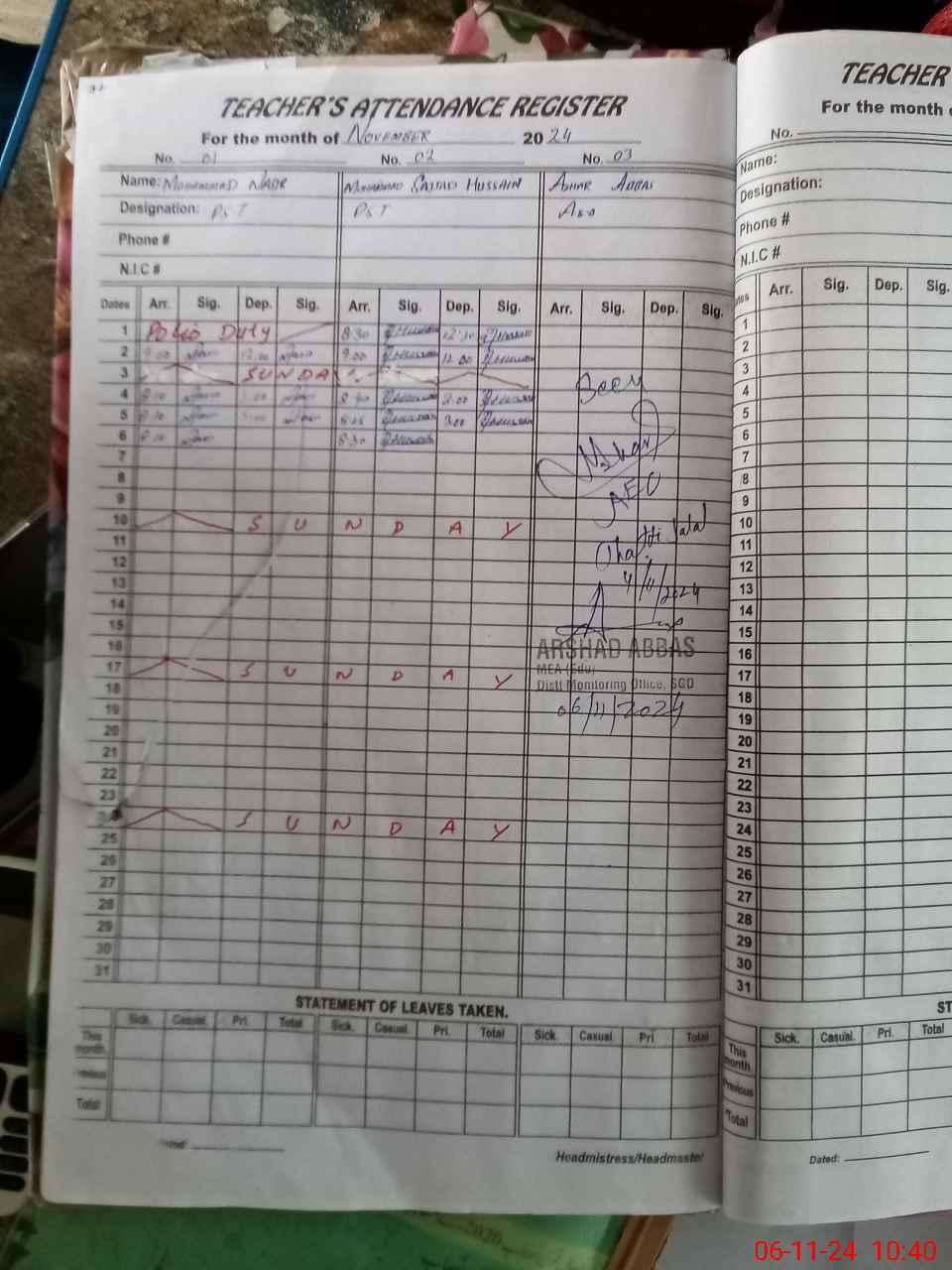 | Monitoring Date: 06-11-2024 | Start Time: 06-11-2024 10:27 AM | End Time: 06-11-2024 10:50 AM | Name of MEA: AR**** AB**** | |