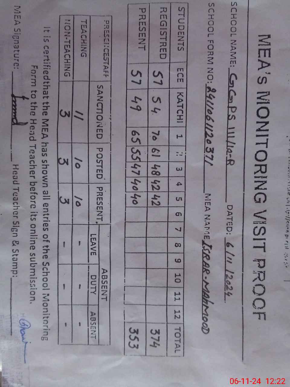 | Attendance Register | Head Teacher | MEA with School | Visit Proof |