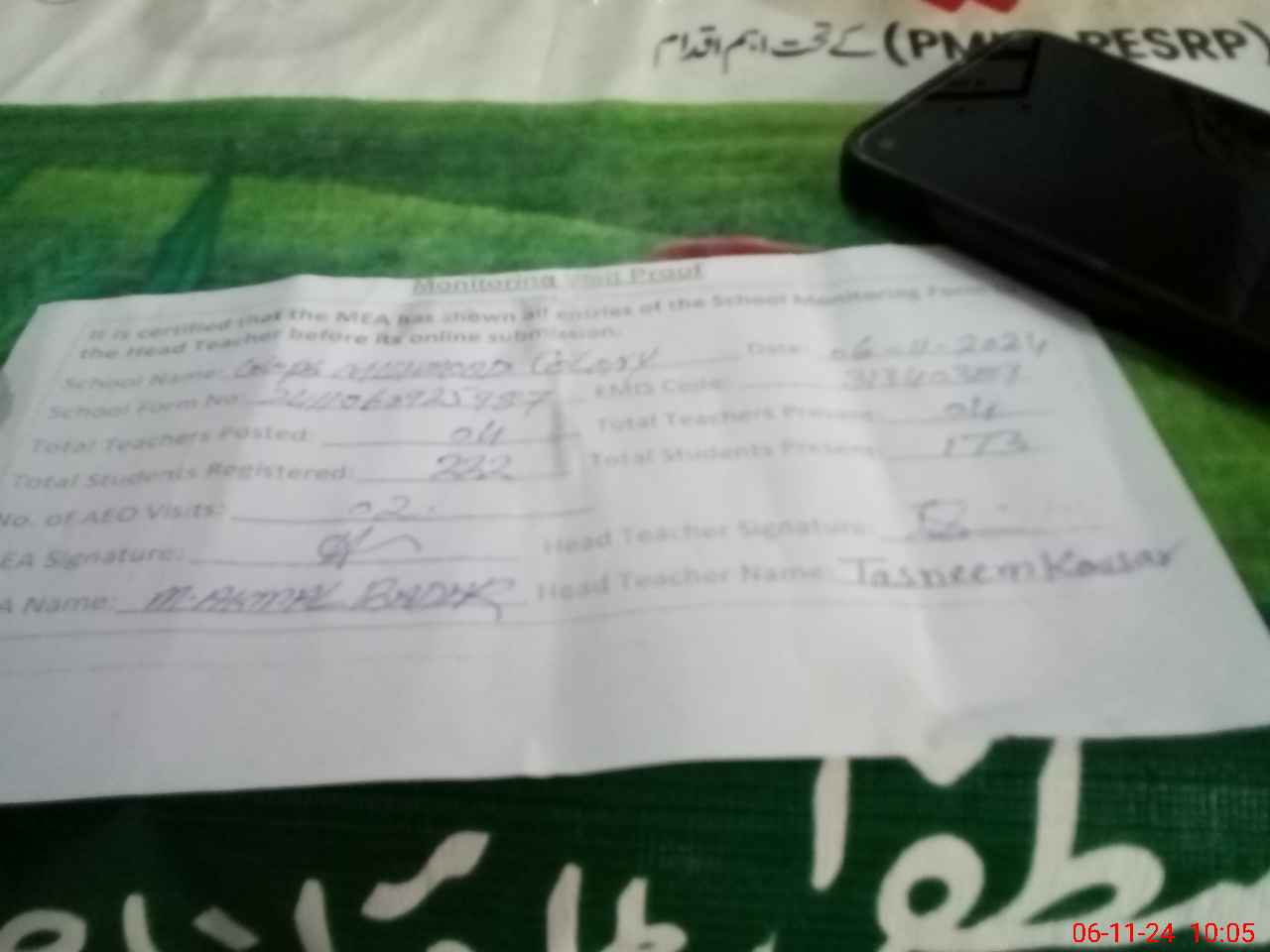 | Monitoring Date: 06-11-2024 | Start Time: 06-11-2024 09:25 AM | End Time: 06-11-2024 10:07 AM | Name of MEA: Mu**** Ak**** Ba**** | |