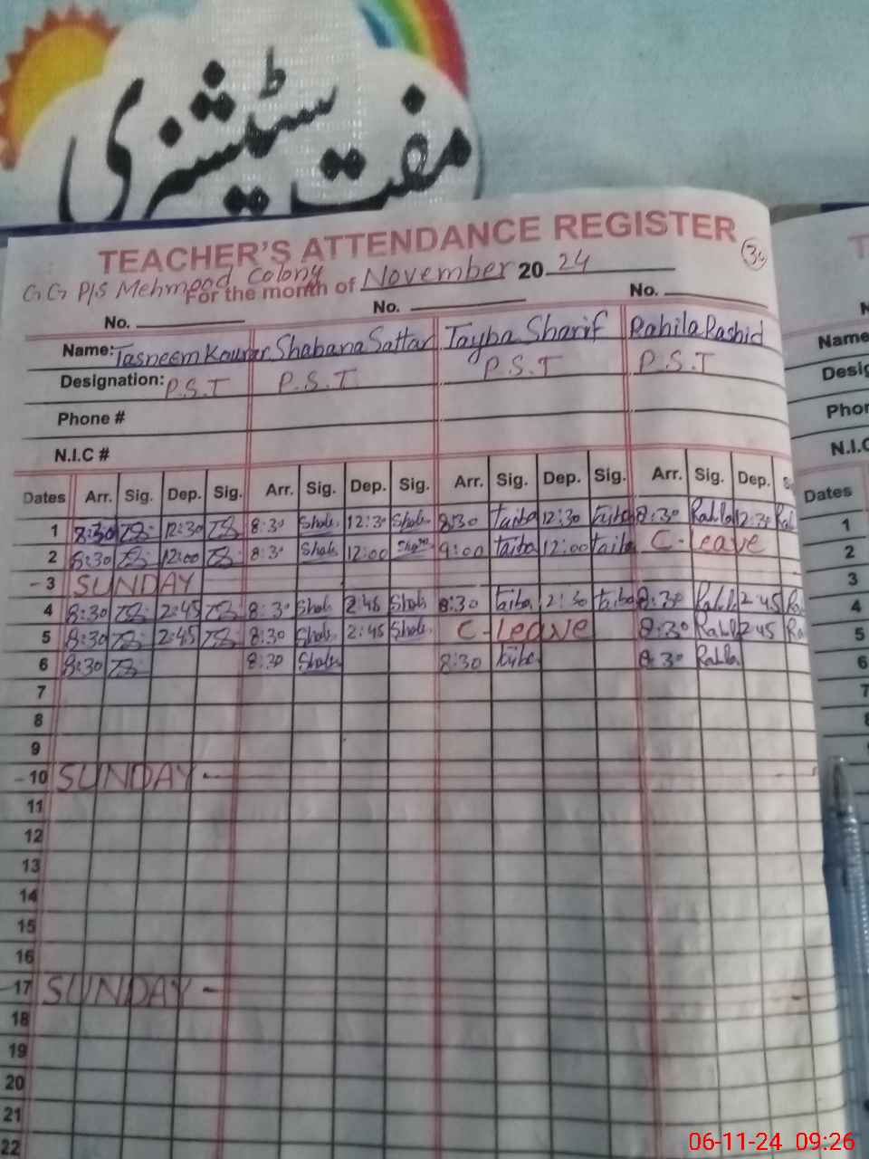 | CNIC | Full Name | Designation | R/C | Absence During Last Calender Month |