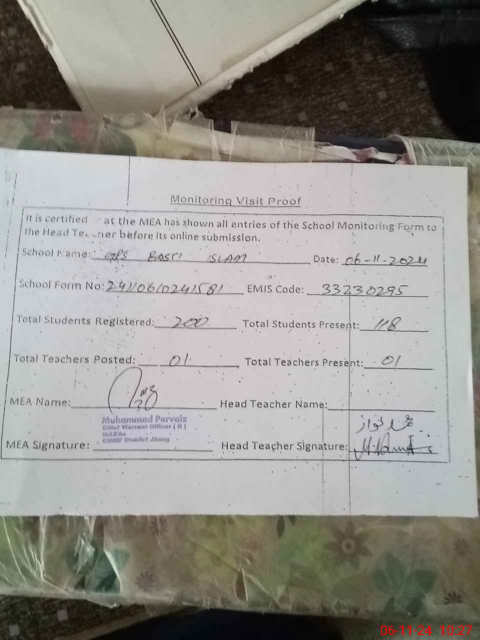 | Attendance Register | Head Teacher | MEA with School | Visit Proof |