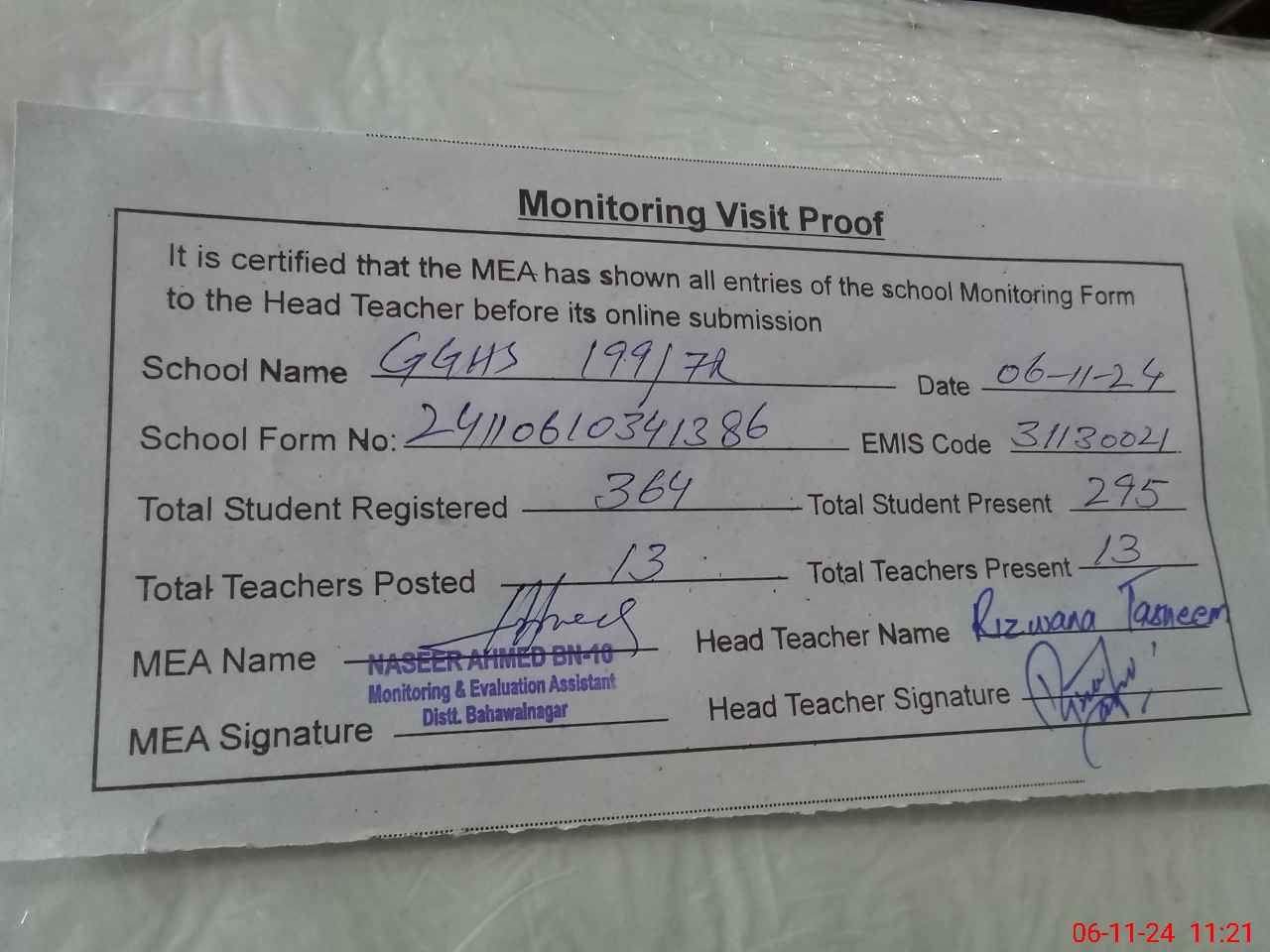 | Monitoring Date: 06-11-2024 | Start Time: 06-11-2024 10:34 AM | End Time: 06-11-2024 11:28 AM | Name of MEA: NA**** AH**** BN**** | |