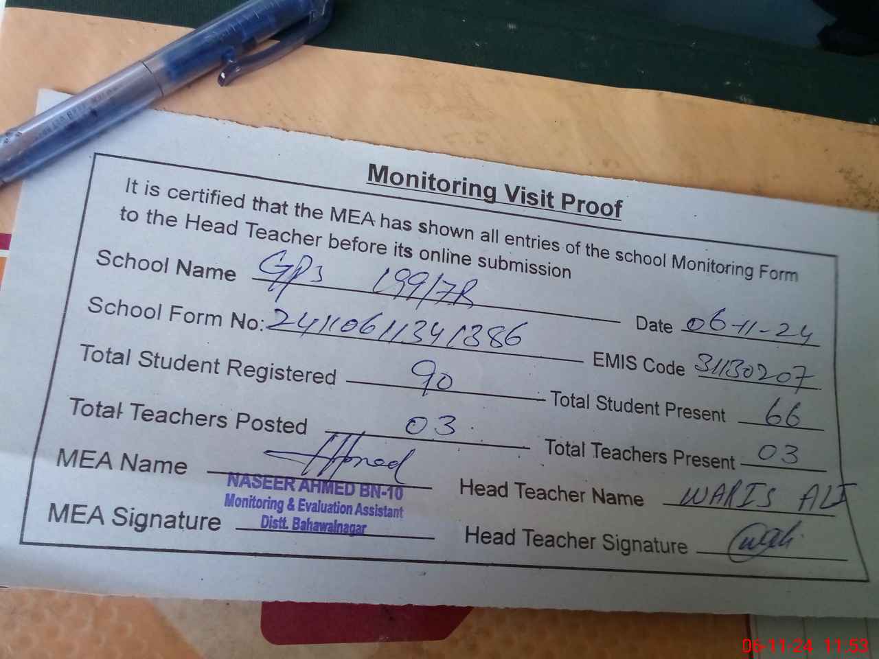 | Attendance Register | Head Teacher | MEA with School | Visit Proof |