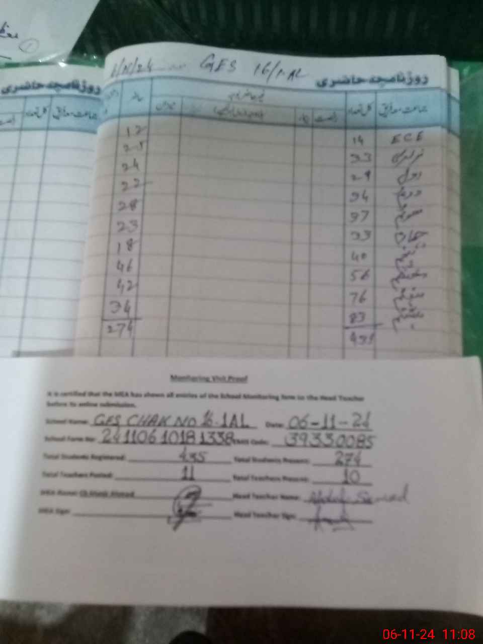 | Attendance Register | Head Teacher | MEA with School | Visit Proof |