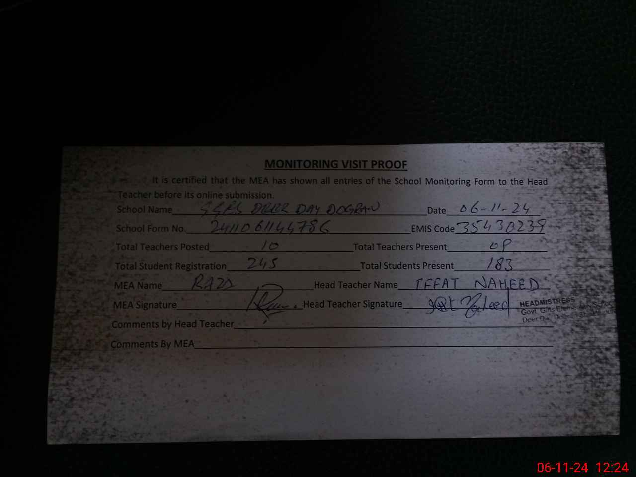 | Attendance Register | Head Teacher | MEA with School | Visit Proof |