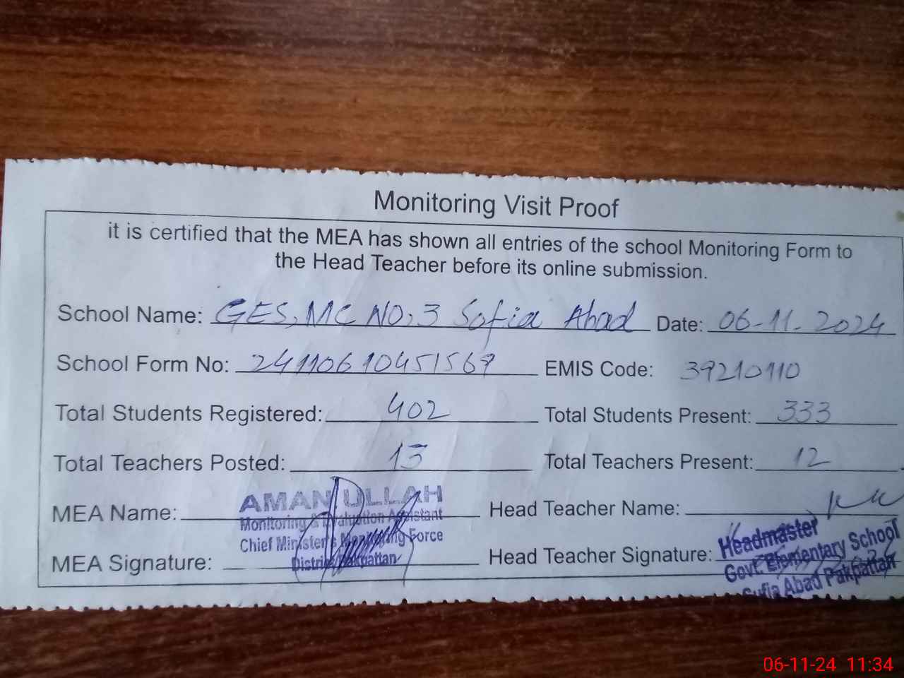 | Attendance Register | Head Teacher | MEA with School | Visit Proof |