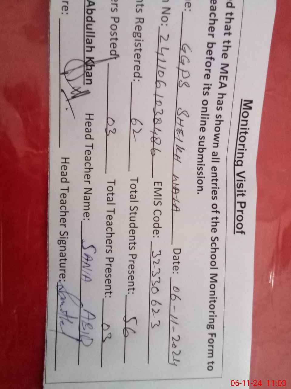 | Attendance Register | Head Teacher | MEA with School | Visit Proof |