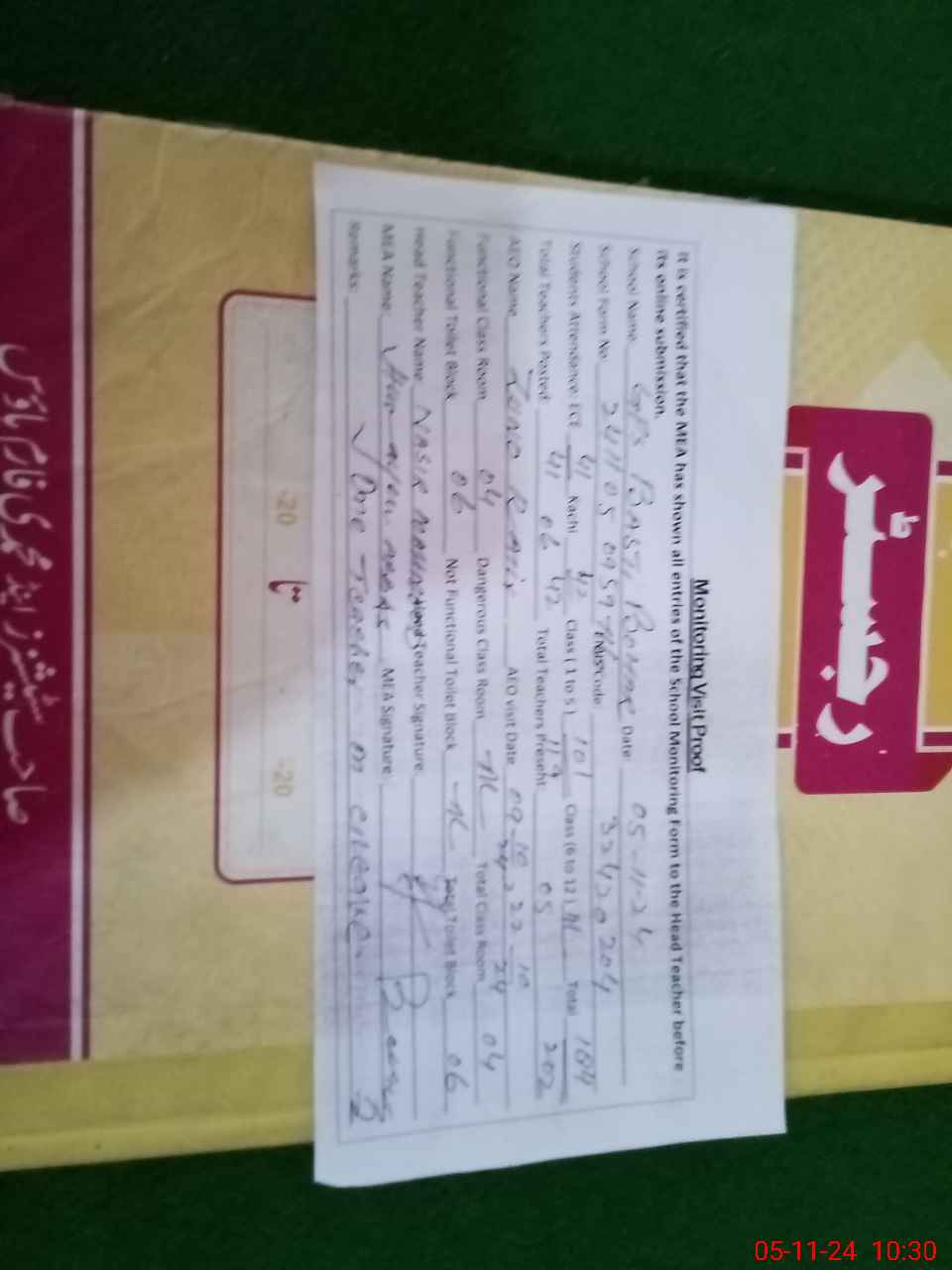 | Remarks (Use Separate Page if Required): One teacher on casual leave over All cleaness Good | |||||