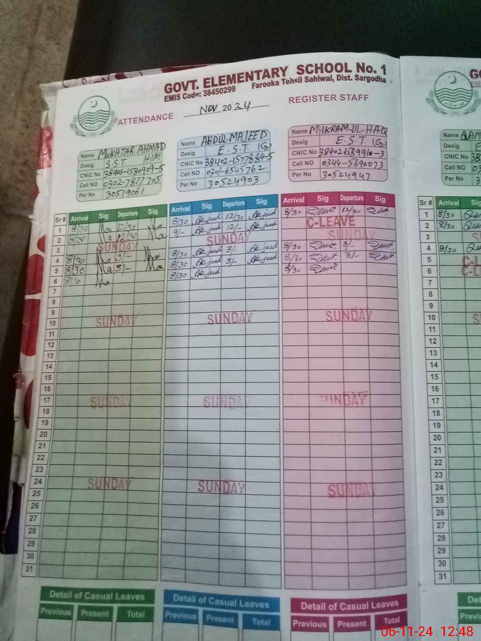| CNIC | Full Name | Designation | R/C | Absence during last cal. month |