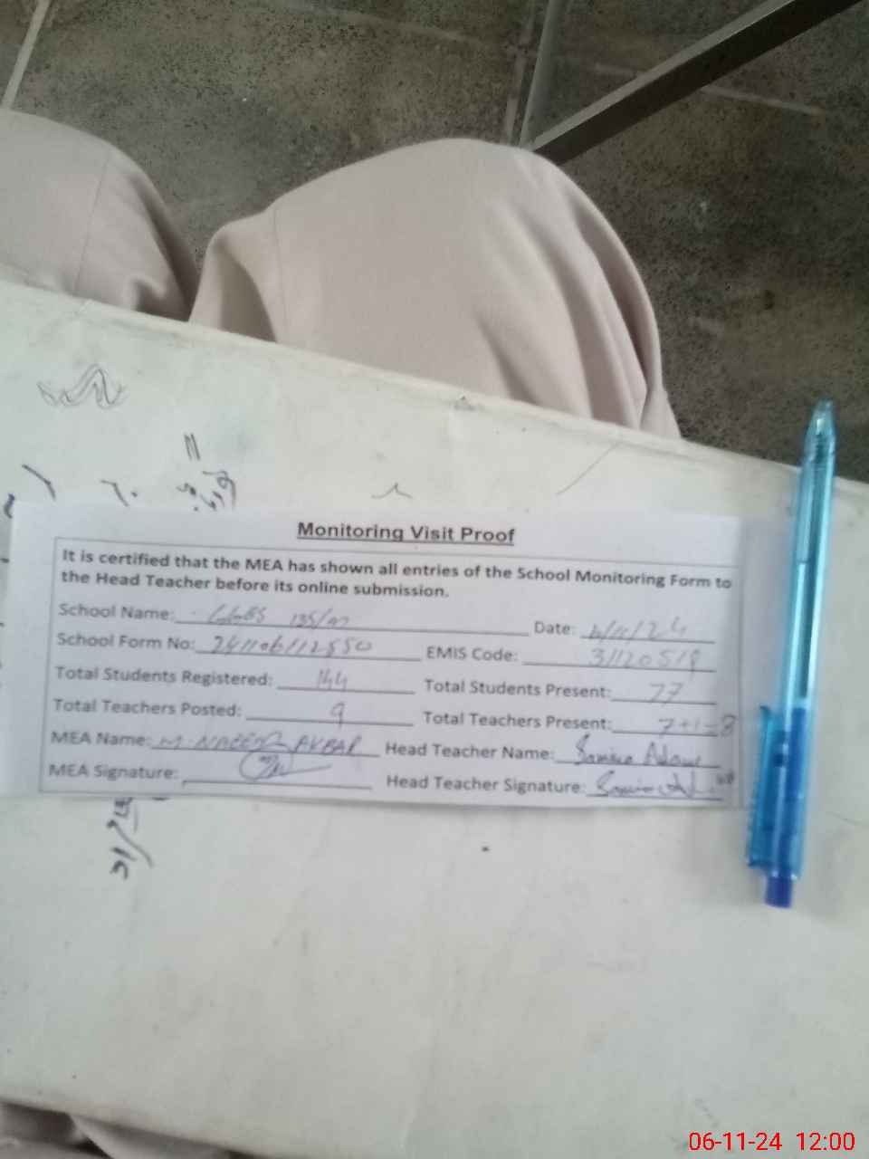 | Attendance Register | Head Teacher | MEA with School | Visit Proof |