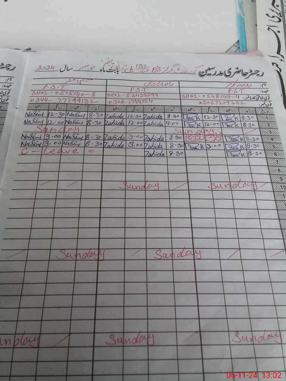 | CNIC | Full Name | Designation | R/C | Absence During Last Calender Month |