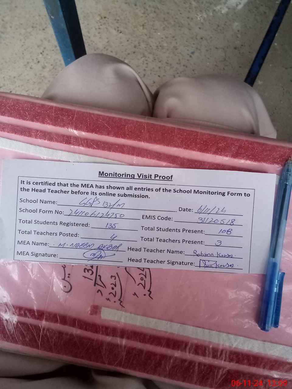 | Attendance Register | Head Teacher | MEA with School | Visit Proof |