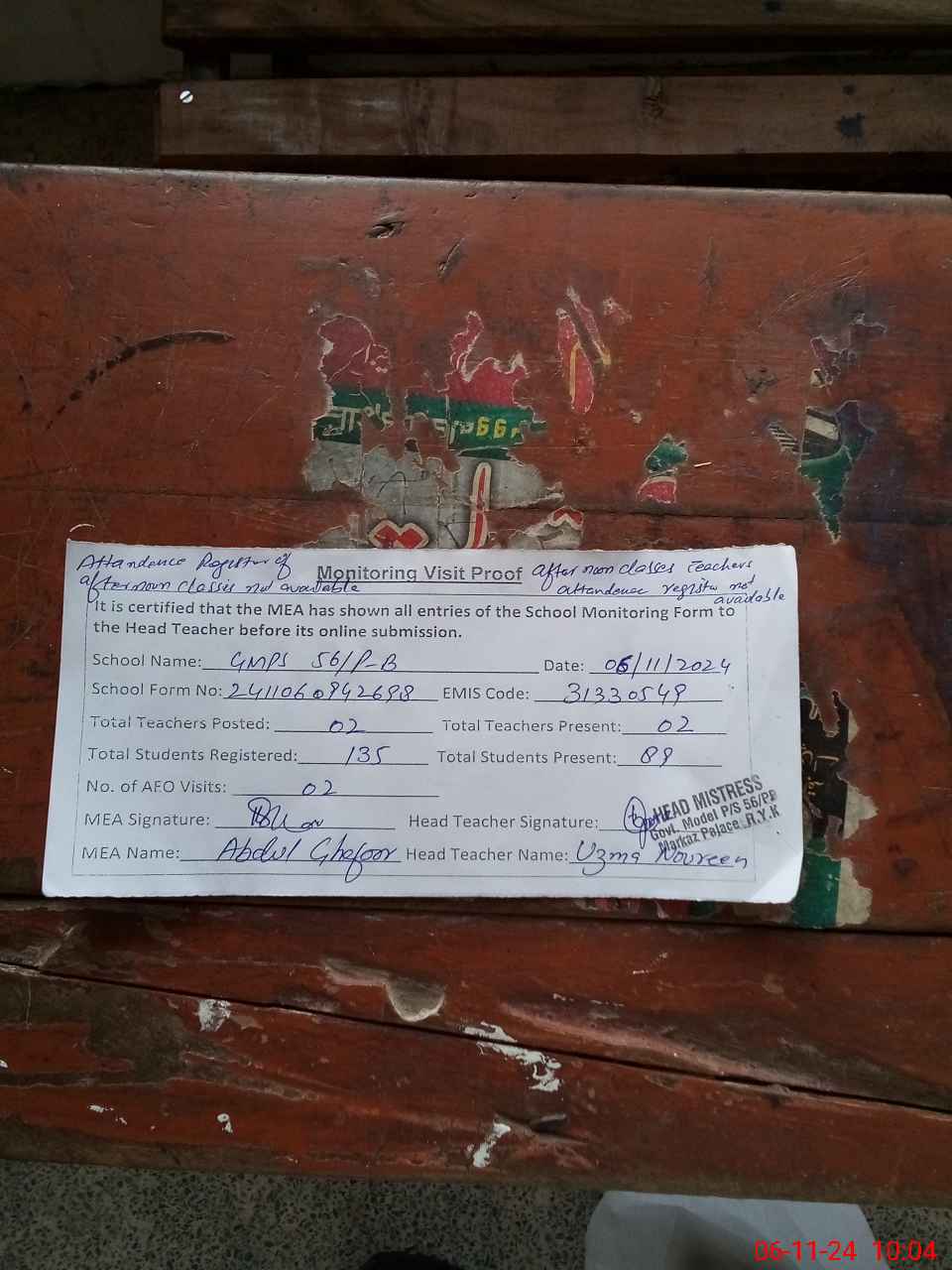 | Attendance Register | Head Teacher | MEA with School | Visit Proof |