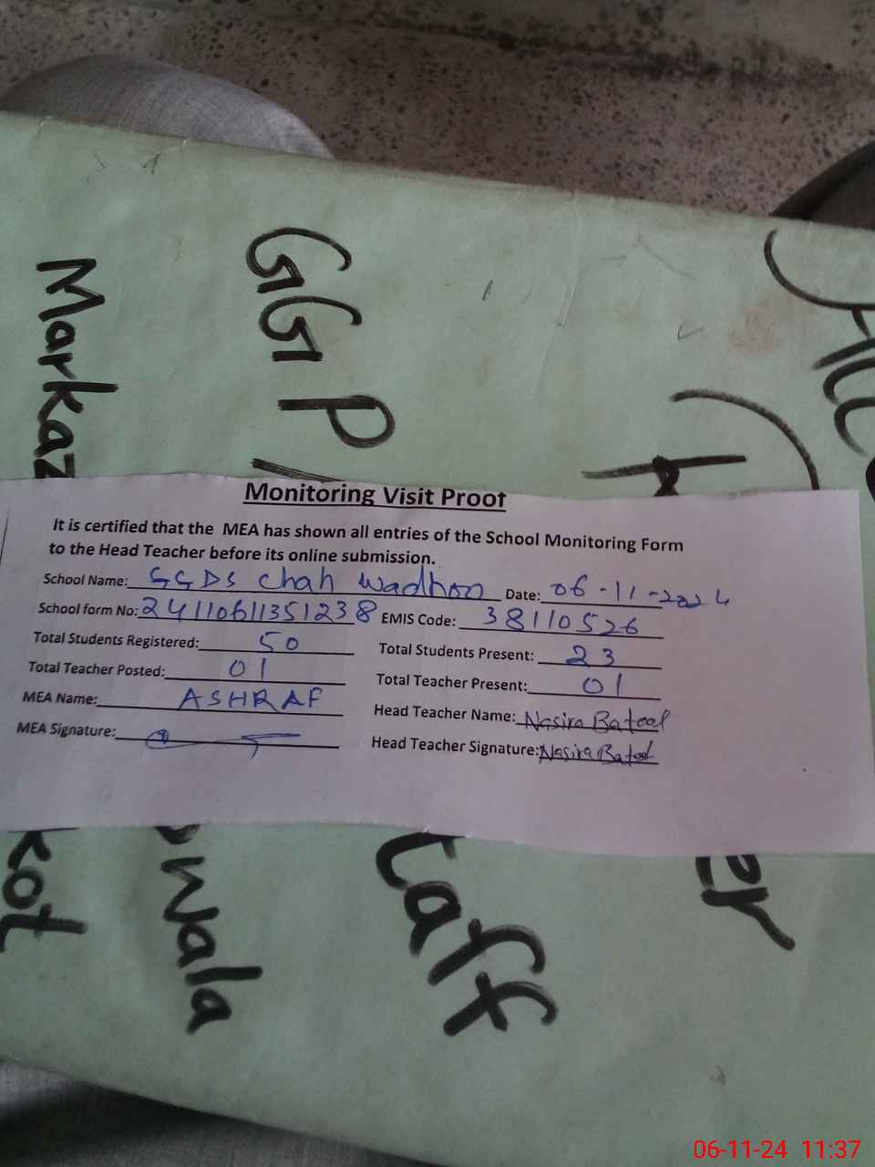 | EMIS Code: 38110526 | Name of School: GGPS CHAH WADHOO WALA | |||