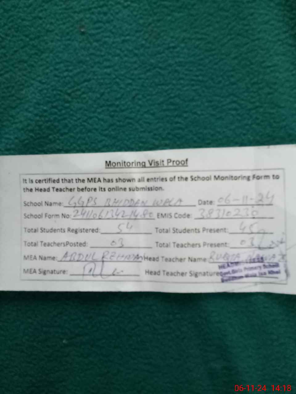 | Attendance Register | Head Teacher | MEA with School | Visit Proof |