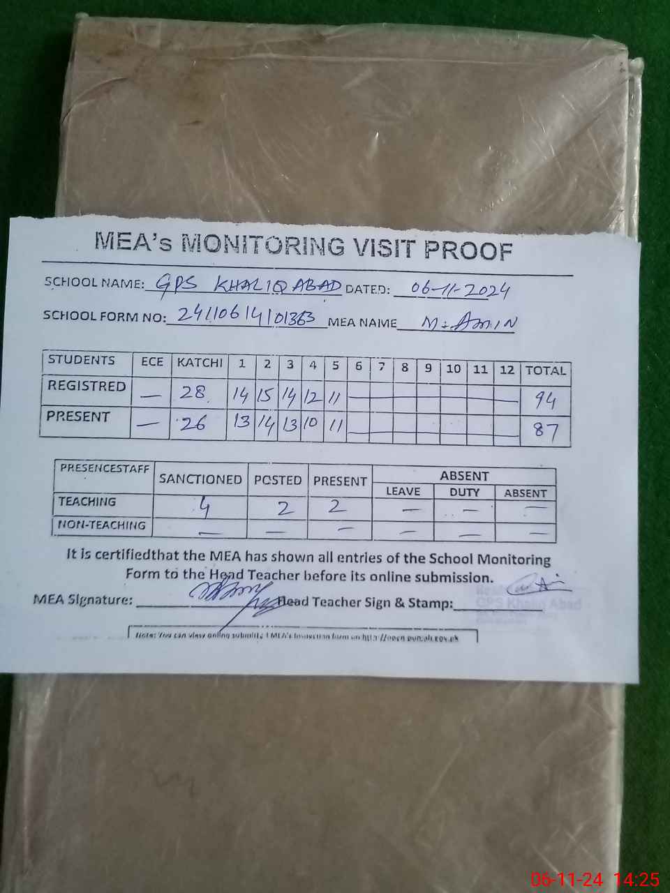| Attendance Register | Head Teacher | MEA with School | Visit Proof |