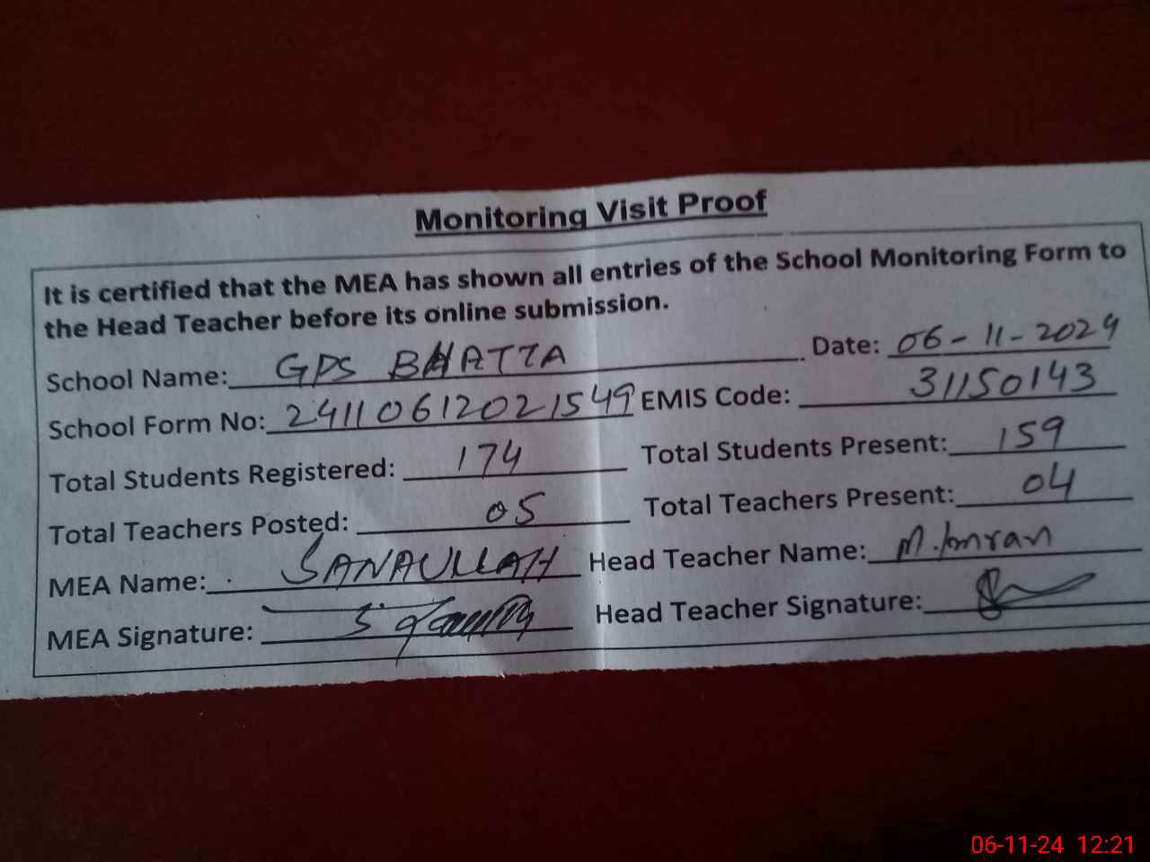 | Attendance Register | Head Teacher | MEA with School | Visit Proof |