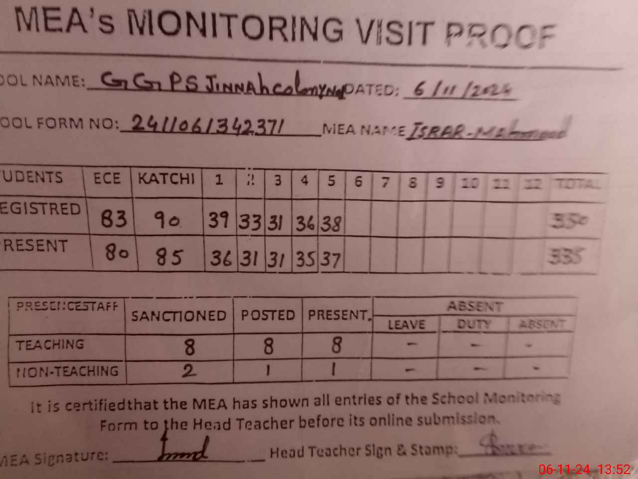 | Attendance Register | Head Teacher | MEA with School | Visit Proof |
