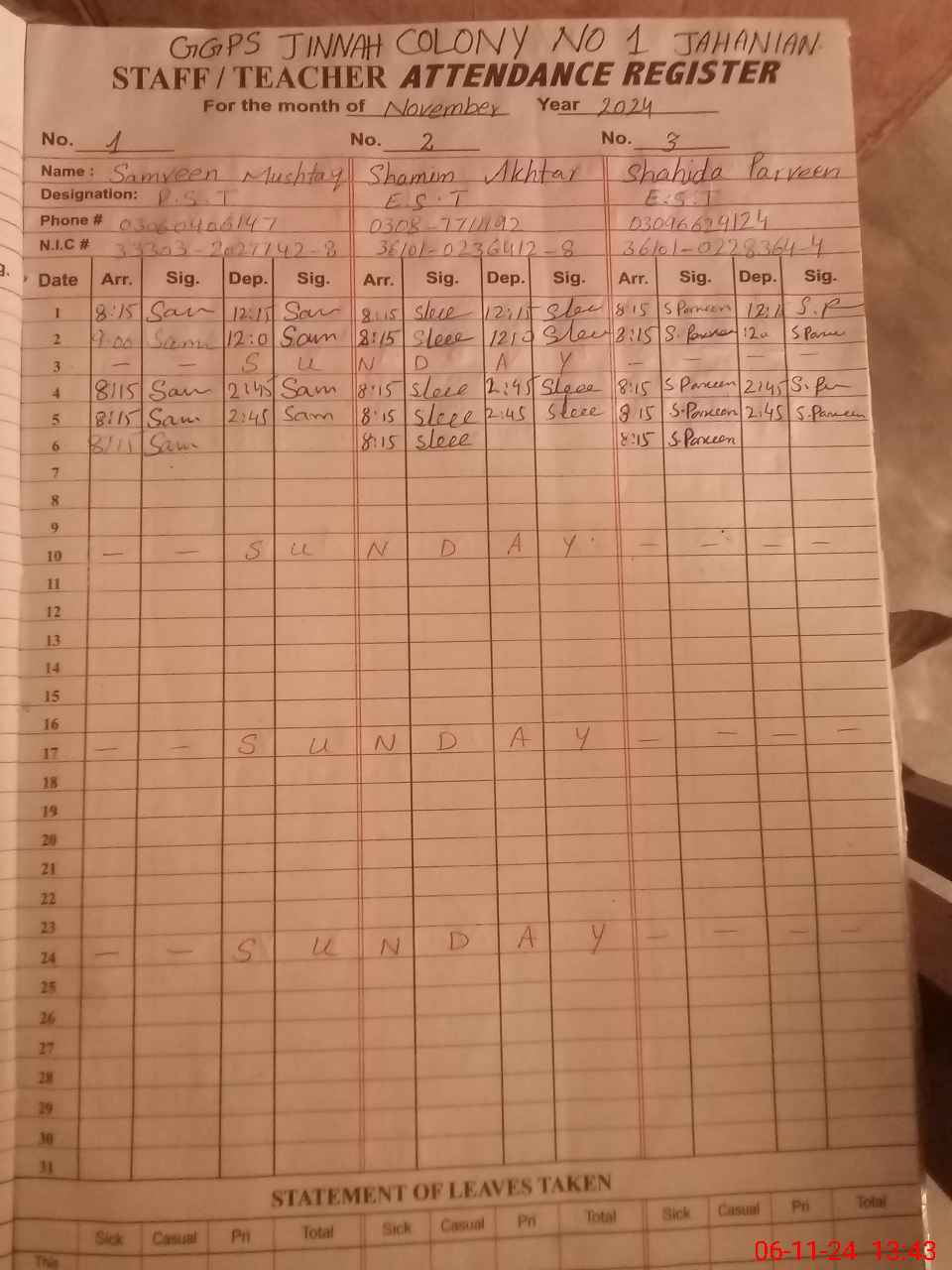 | CNIC | Full Name | Designation | R/C | Absence During Last Calender Month |